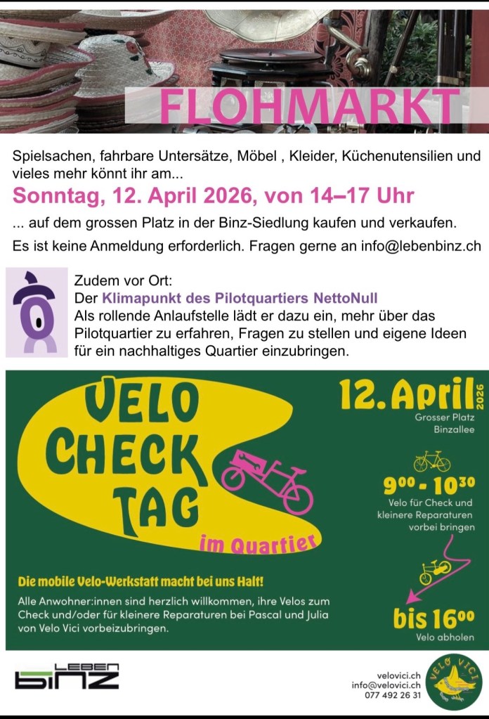 Am Sonntag, 12. April 2026, findet von 14:00–17:00 Uhr unser Flohmarkt auf dem grossen Platz in der Binz-Siedlung statt. Es darf alles für Gross und Klein angeboten werden.